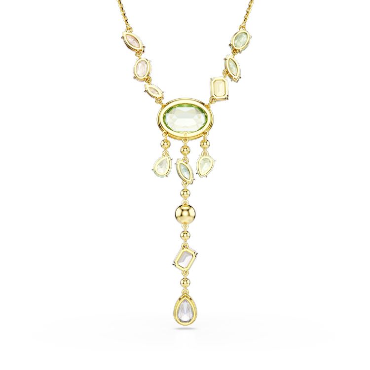 Coming to life with a wealth of saturated hues, this gold-tone plated necklace is made to impress. Crafted in a Y-shaped design, the necklace features a green oval crystal in the middle, surrounded by crystals in different shapes, sizes and shades. The Swarovski ReCreated™ crystals included in the composition further enhance the gradation of sheer joy.