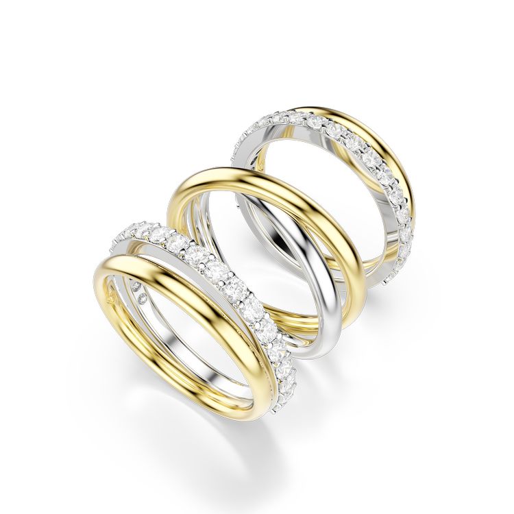 To infuse your style with versatility, this Swarovski jewelry features three rings that can be worn alone or stacked together for a dynamic combination. Echoing the signature silhouette of the Hyperbola family, the twisting rings combine rhodium and gold-tone plating, along with clear Swarovski Zirconia in delicate round cuts. Wear them with matching earrings or a necklace to emphasize the hypnotic look.