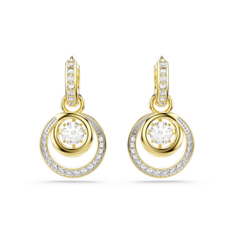 Inject movement into your style with these circular gold-tone plated earrings. Connected to mini pavé hoops, each piece features a central dancing stone surrounded by spirals of crystals in varying sizes. Wear them with a matching necklace or a ring to emphasize the hypnotic look.