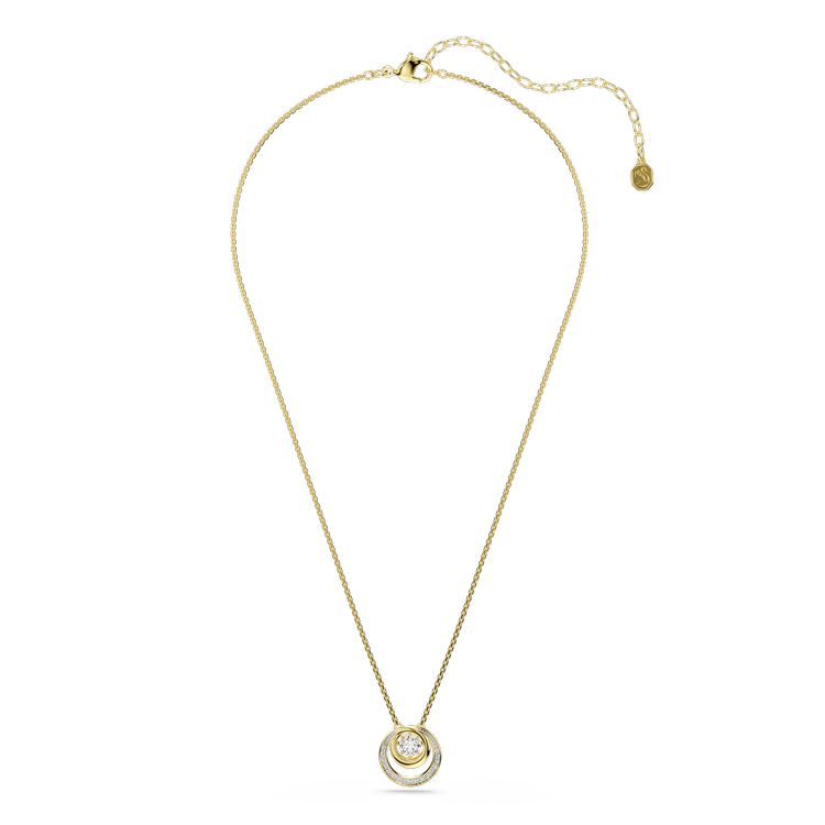 Blurring the line between classic and contemporary styles, this Hyperbola necklace delivers a unique jewelry silhouette. The circular design is gold-tone plated and features a central dancing stone surrounded by a frame of crystals in varying sizes. Wear it with matching earrings or a ring to emphasize the hypnotic look.
