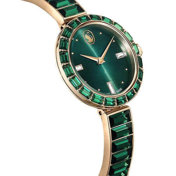Elegance is amplified with crystals in this beautiful jewelry-inspired timepiece. The 25-mm stainless steel design has a champagne gold-tone finish and is encircled by a bezel with 20 baguette-cut green crystals, while a single crystal is set within the crown. Baguette-cut crystals also highlight three index markers on the green dial, which also features a swan logo at 12 o’clock. Around the wrist, the bangle-style bracelet is adorned with 16 baguette-cut green crystals and is fully adjustable for a comfortable fit. The Swiss made watch is water resistant to 50 meters and is the ideal accessory for a mesmerizing style story.