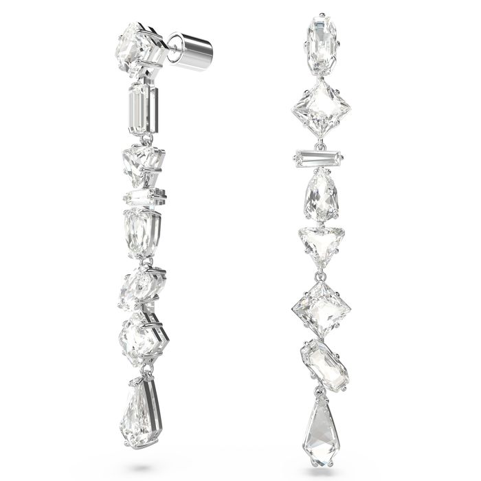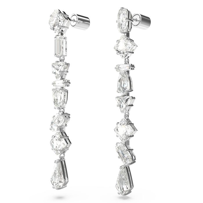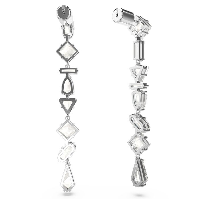 These radiant Mesmera earrings were crafted for extravagant style. Within each piece, the dazzling design features a cascade of prong-set crystals in a rhodium plated setting, with each stone crafted in a different shape. A wondrous mix of light-catching facets that make an elegant gift for a loved one.