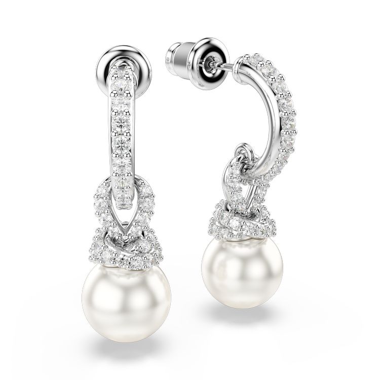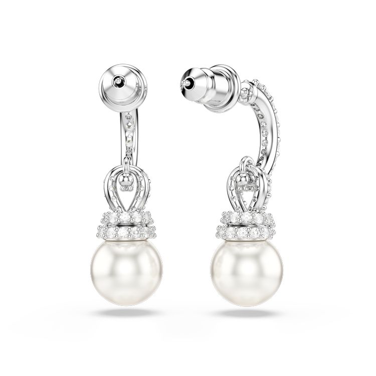 Amplify the elegance in your style with these pierced Swarovski earrings. The rhodium plated pieces feature open hoops and delicate connections that are embellished with pavé, while the Swarovski Crystal Pearls add a classic touch of pure refinement. It’s the reimagination of a timeless look that you can wear for almost any occasion.