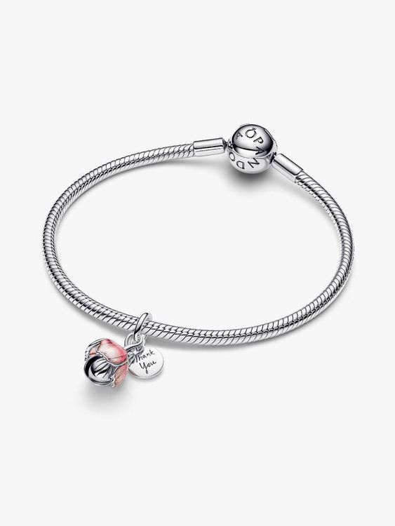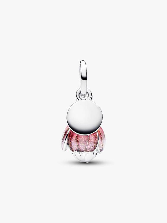 Ανθίστε με ευγνωμοσύνη. Το κρεμαστό λουλούδι μας από ασήμι 925 ανοίγει σε τρία στρωματοποιημένα πέταλα με ένα επιχρυσωμένο κέντρο 14 καρατίων, έναν πράσινο τεχνητό κρύσταλλο και λαμπερή ροζ ρητίνη, με χαραγμένη την ένδειξη «Ευχαριστώ» στον δίσκο.