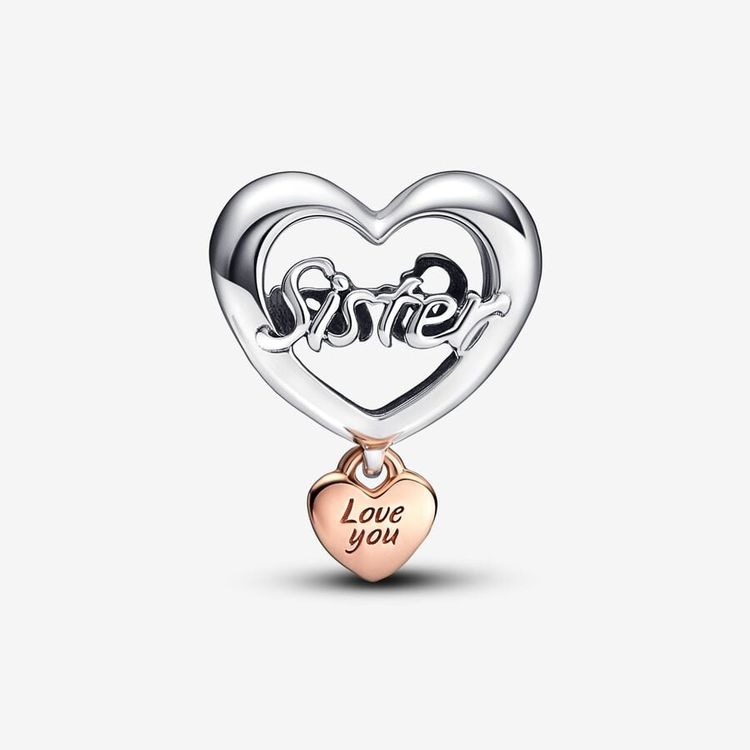 Η αγάπη σε αυτό το σύμβολο αποτυπώνεται με δύο αποχεώσεις που γιορτάζουν την οικογένεια και τη χαρά που αυτή σου φέρνει. Μια χαραγμένη καρδιά με επίστρωση ροζ χρυσού 14Κ κρέμεται κάτω από μια ασημένια καρδιά με τη λέξη «Sister». Φορέστε το και εκφράστε τα συναισθήματά σας προς το αγαπημένο σας πρόσωπο.