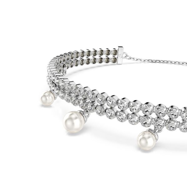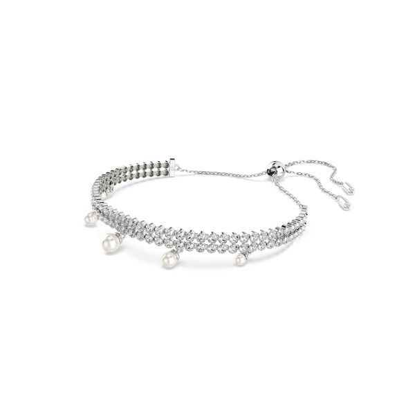 Ανακαλύψτε την αγνή έκφραση της κομψότητας σε αυτό το εκλεπτυσμένο βραχιόλι. Το σχέδιο με επιμετάλλωση ροδίου ρυθμίζεται εύκολα χάρη στο συρόμενο κούμπωμα με μπίλια και διαθέτει δύο σειρές με αλυσίδες με υποδοχές, διακοσμημένες με διαφανή Swarovski Zirconia σε στρογγυλές κοπές. Στο κάτω μέρος, έχει προστεθεί διακόσμηση από Swarovski Crystal Pearls, για μια εκθαμβωτική πινελιά πολυτέλειας. Φορέστε αυτό το βραχιόλι με το ασορτί τσόκερ, για να δημιουργήσετε τον δικό σας εκφραστικό συνδυασμό.