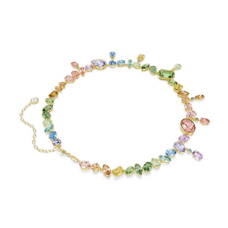 Στο χαρακτηριστικό στυλ της οικογένειας Gema, αυτό το ζωηρό κολιέ κοσμείται από ένα συνονθύλευμα διαφορετικών σχημάτων και χρωμάτων. Περίπου 356 κρύσταλλα περιλαμβάνονται στο σχέδιο με επιμετάλλωση σε χρυσό τόνο, συμπεριλαμβανομένης μιας ποικιλίας από Swarovski ReCreated™ crystals, αρμονικά τοποθετημένα ώστε να συνθέτουν μια ζωντανή έκρηξη χαράς. Οι κρεμαστές λεπτομέρειες προσδίδουν επιπλέον κίνηση και γοητεία, ενώ η επέκταση στο πίσω μέρος σάς επιτρέπει να προσαρμόζετε το μήκος του κολιέ ανάλογα με τις προτιμήσεις σας.
